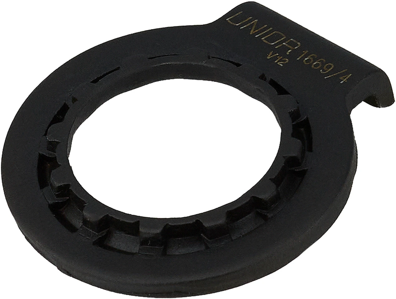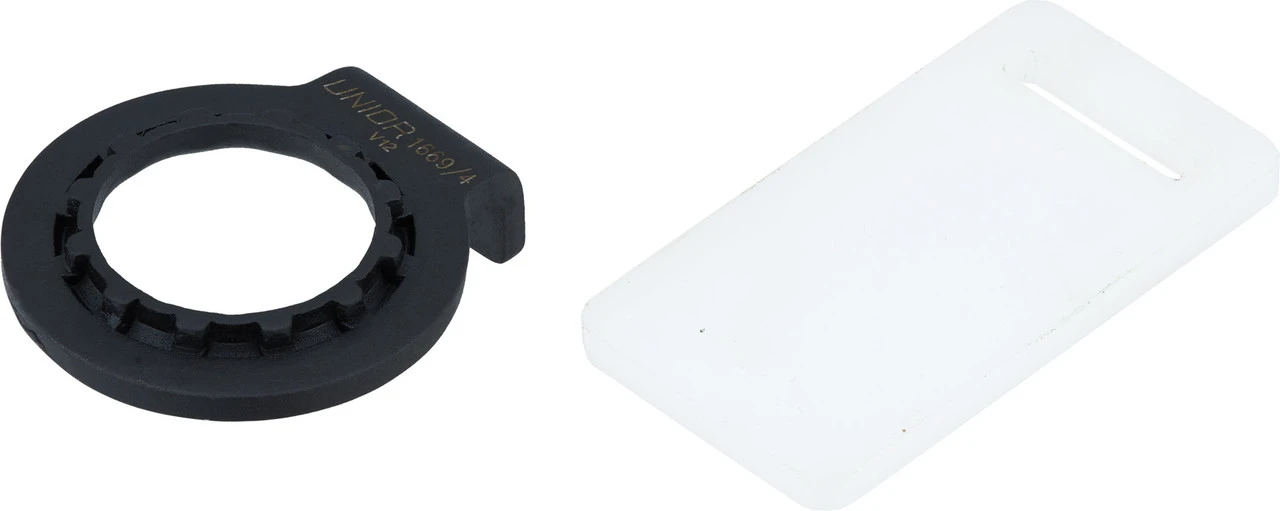 Das Unior Bike Tools 2-in-1-Werkzeug 1669/4 vereint eine Kassettenabnehmer- und eine Nippelspanner-Funktion. Es eignet sich ideal für längere Fahrradtouren oder Radreisen, auf denen Du möglichst wenig Zubehör mitnehmen möchtest. Das Tool leistet Dir unkomplizierte Hilfe, wenn Du schnell die Kassette abnehmen musst, um z. B. am Laufrad hinten rechts eine Speiche zu wechseln. Es wird zwischen dem Kassetten-Lockring und der Achsmutter eingesetzt und sorgt dafür, dass sich der Lockring beim Herunterdrücken des Pedals löst. Genauso ziehst Du damit nach erneutem Einbau der Kassette den Lockring fest. Eine Schutzplatte aus Kunststoff gegen Verkratzen des Rahmens liegt bei. Das Werkzeug lässt sich auch als Nippeldreher der Größe 3,3 mm verwenden. Es besteht aus Premium-Kohlenstoffstahl und wurde für mehr Haltbarkeit brüniert.