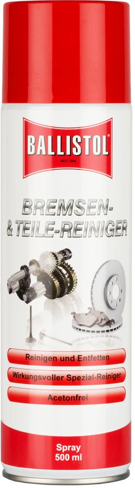 Der Ballistol Bremsenreiniger und Teilereiniger eignet sich zur Reinigung und Entfettung von schmutzigen, öligen oder fettigen Maschinenteilen, Industrieteilen, Bremsen sowie Bremsscheiben. Auch für Bremsklötze kann der Teilereiniger bedenkenlos angewendet werden. Er entfernt Öl, Fett, Schmutz und sogar eingetrocknete und verharzte Öle. Der Teilereiniger lüftet rückstandsfrei ab und besitzt einen angenehmen Duft und hohe Materialverträglichkeit. Auch auf Lacken und den meisten Arten von Kunststoff und Gummi kann der Bremsenreiniger von Ballistol problemlos angewendet werden.