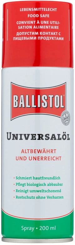 Auszeichnungen:Ballistol ist absolut hautfreundlich und wurde von Dermatest mit “ Sehr Gut“ getestet.Die Zeitschrift “ selbst ist der Mann“ berichtet in der Ausgabe Nr. 7 / Juli 2013 über Ballistol Universalöl. “ selbst ausprobiert“ verlieh diesem Öl 5 Hämmer von 5.Features:pflegt, schmiert, desinfiziert, schützt vor Rostkriecht in feinste Winkel, ist gleitaktivverharzt nicht, ist biologisch vollständig abbaubarlebensmittelecht, hautverträglich und völlig unbedenklichder Geheimtipp für Heimwerker, Industrie und Handwerkreinigt Ketten, Federgabeln und Bowdenzügeideal zum Einwintern und Restaurierenbestens geeignet zur Reinigung und Pflege von Fox und RockShox FedergabelnHerstellernummern:50 ml:21450200 ml:21700400 ml:21810Lieferumfang:1 x Universalöl Ballistol Spraydose