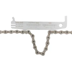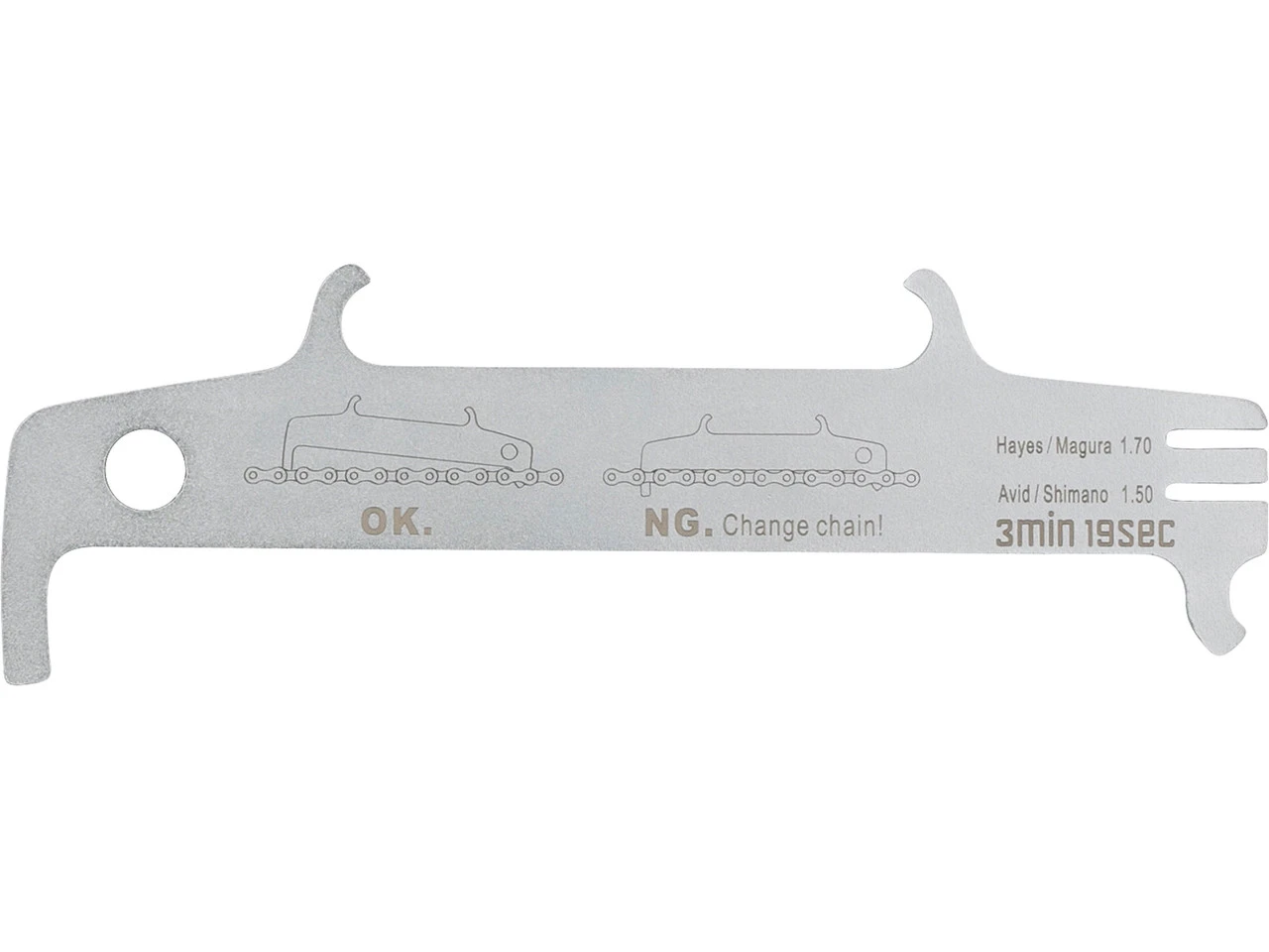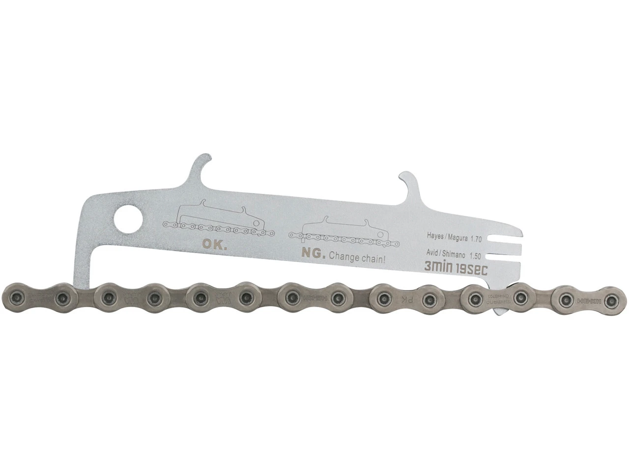 Mit der Kettenverschleißlehre 2.0 von 3min19sec misst Du binnen kürzester Zeit aus, wie stark Deine aktuelle Fahrradkette bereits verschlissen ist. Dazu legst Du die kleine Nase mit der Einkerbung an einer Rolle der Kette an. Dann klappst Du die Kettenverschleißlehre runter in Richtung Kette. Bleibt die lange Nase hängen, kannst Du die Kette weiter fahren. Fällt die Nase durch, ist eine Kettenlängung von 0,75 % erreicht. Dann solltest Du die Kette wechseln, um einem vorzeitigen Ritzelverschleiß vorzubeugen. Die Kettenlänge sollte an mehreren Stellen der Kette gemessen werden, um Unregelmäßigkeiten auszuschließen. Die Kettenhaken auf der Rückseite ermöglichen Dir ein entspanntes Vernieten der Kette, wenn Du einen Tausch vornehmen musst.