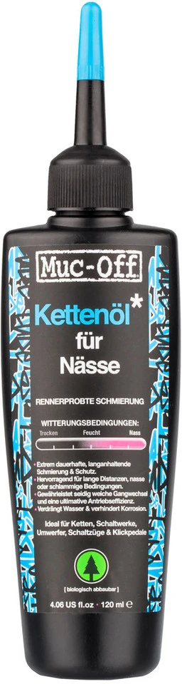 Spezifikationen:Bezeichnung:MUC-OFF WET LUBEAnwendungsbereich:SchmiermittelFeatures:bietet perfekte Schmiereigenschaftenbei nassen, schlammigen Bedingungenwasserabweisender Schutz für die Kettereduziert Reibung für sanfte und ruhige GangwechselFormel auf Pflanzenölbasisfür Kette, Schalthebel und SchaltwerkePipettensystem für die einfache Anwendungideal für Rennrad, Cyclocross und MTB100 % biologisch abbaubarGefahrstoffkennzeichnung:Keine Kennzeichnung erforderlich.