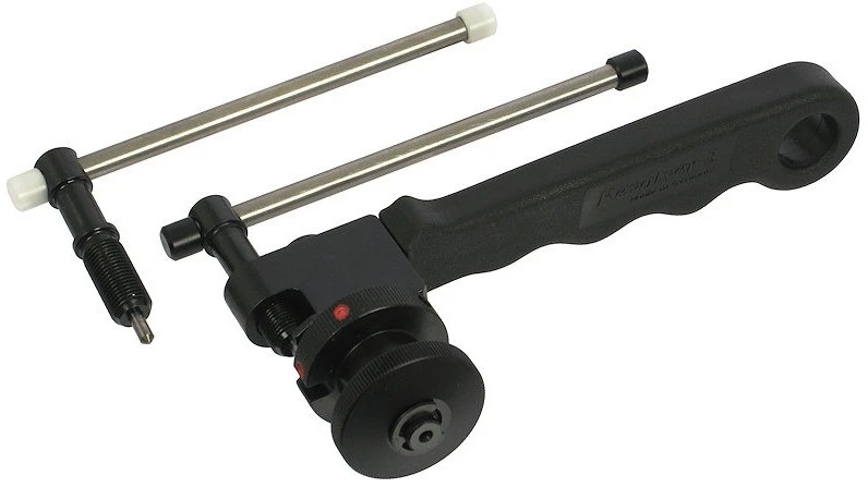 Egal welches Ketten-Verschlusssystem, der Rohloff Revolver 3 beherrscht sie alle. Ketten am Fahrrad werden höchsten Belastungen ausgesetzt. Immer feinere Materialstärken benötigen immer präzisere Nietwerkzeuge. Der Rohloff Revolver 3 ist der absolute Profi beim Öffnen und Verschließen aller Arten von Schaltungsketten und Singlespeed-Ketten in 1/2″ x 3/32″ und 1/2″ x 1/8″ ; aktuelle 12-fach-Ketten lassen sich damit ebenso öffnen und kürzen. Und dank zweiter Spindel ist er auch für 10-fach, 11-fach sowie 12-fach Campagnolo-Ketten geeignet.