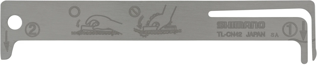 Das Shimano Kettenmesswerkzeug TL-CN42 ist eine Kettenlängungslehre, mit der man den Verschleiß einer Kette genau, einfach und schnell ermitteln kann. Laserschnitt und 3-Pin-Design sorgen für höchste Präzision. TL-CN42 besteht aus hitzegehärtetem Stahl.