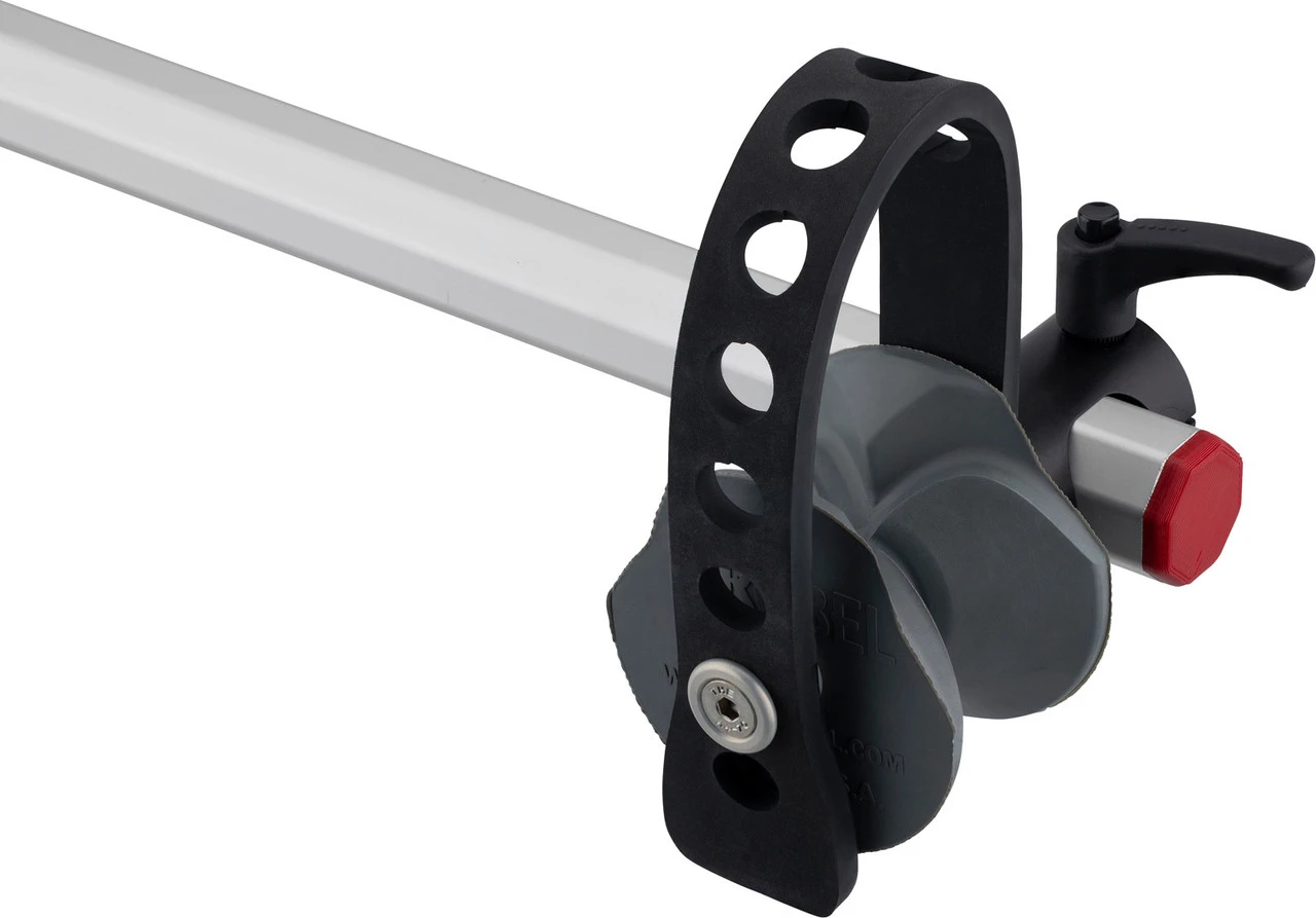 Die Klammer hält den Rahmen zudem näher am Schwerpunkt, wodurch störendes Wippen minimiert wird. Da das Rad deutlich höher platziert werden kann, ist die Arbeit daran spürbar komfortabler und besonders rückenschonend. Die Bindungen sind aus lackfreundlichem Material und durch ihre durchdachte Form an nahezu jede denkbare Rahmenform anpassbar.