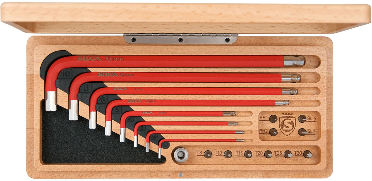Lieferumfang:1 x Schatulle SILCA aus Birkenholz8 x Innensechskantschlüssel10 x Bits1 x Adapter