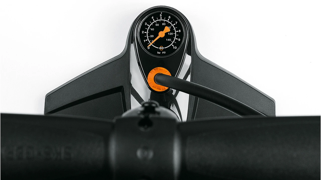Stabile und extrem leichte Kunststoff-Standpumpe mit Manometer zur präzisen Druckkontrolle. Anziege in bar und psi. Einfache Handhabung durch den bewährten SKS-Pumpenkopf mit Klemmhebel. Pumpt leicht bis 8 bar / 15 psi.