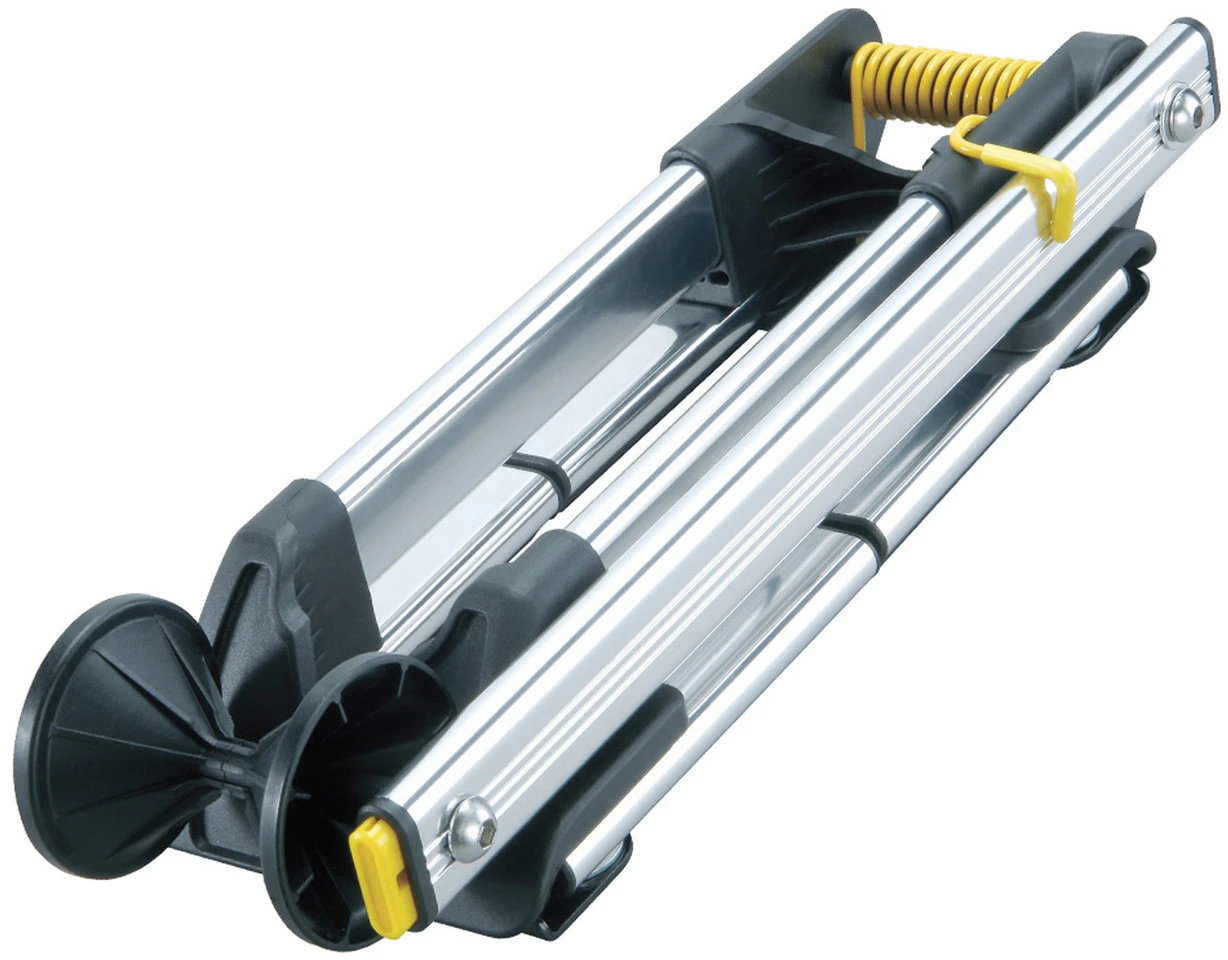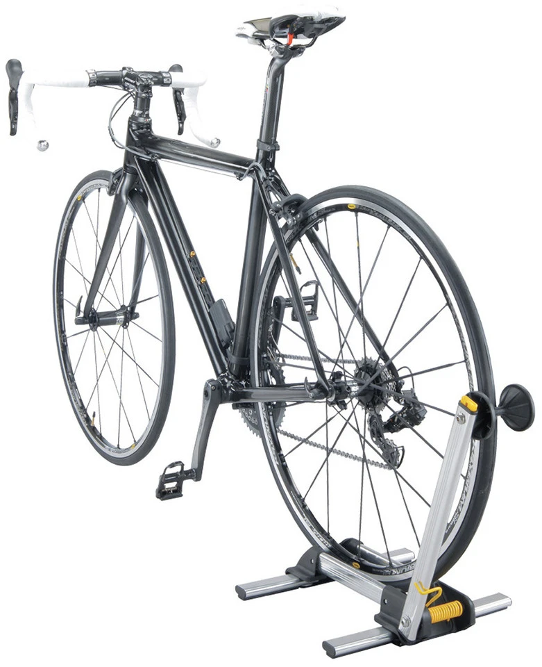 Kompakter, faltbarer Ständer für jede Fahrradreifengröße von 20 – 29″ . Federgelagerte Mechanik passt sich automatisch jeder Reifengröße an. Perfekt für Ordnung im Team-Zelt oder in der Werkstatt.